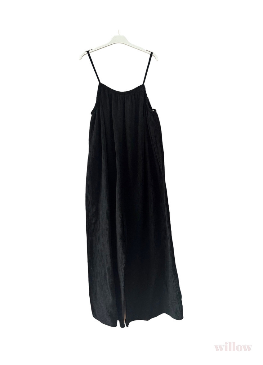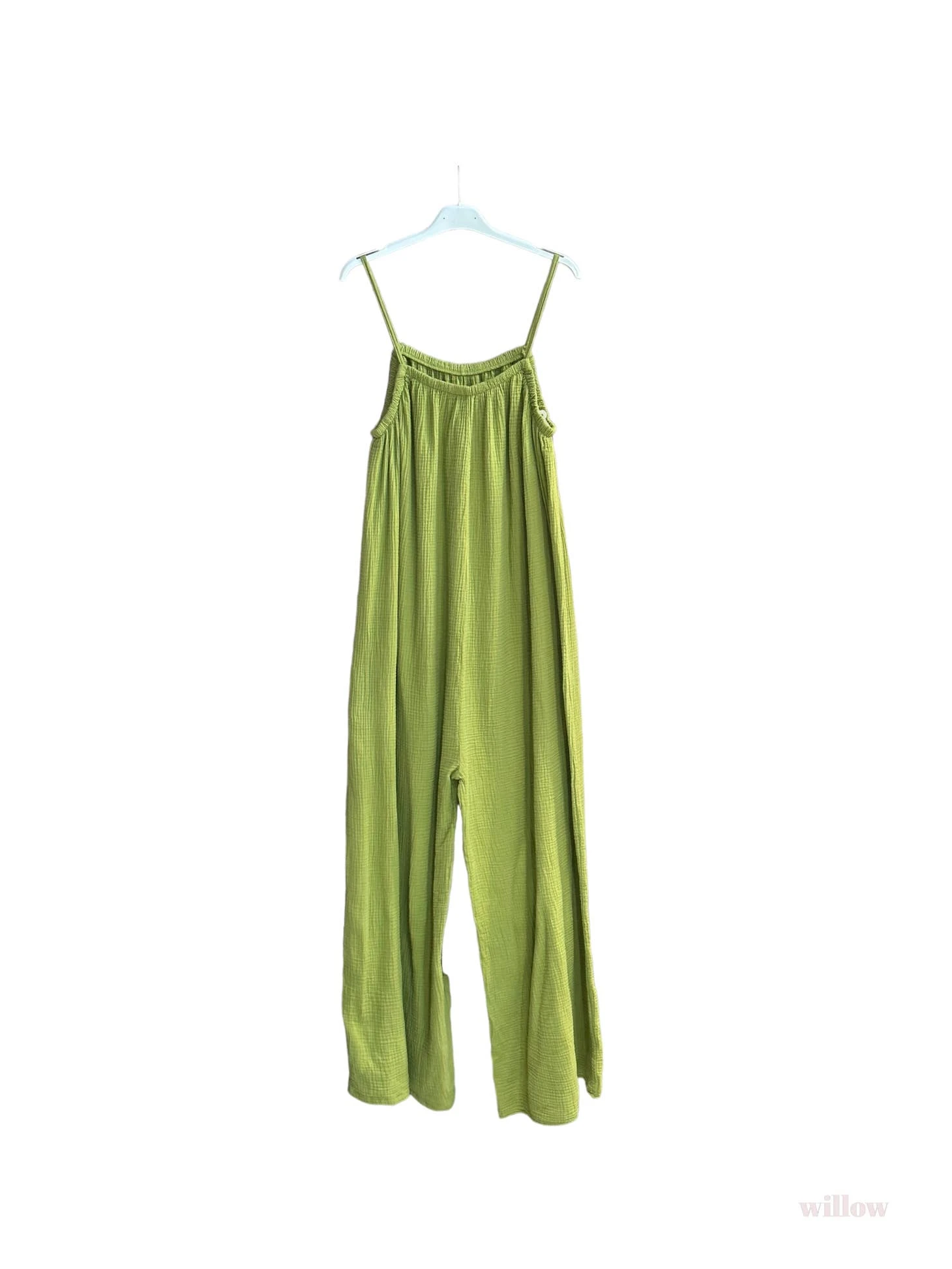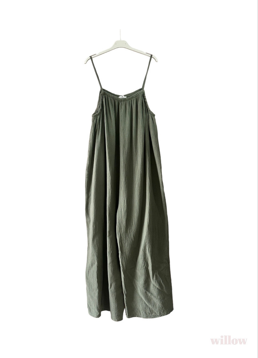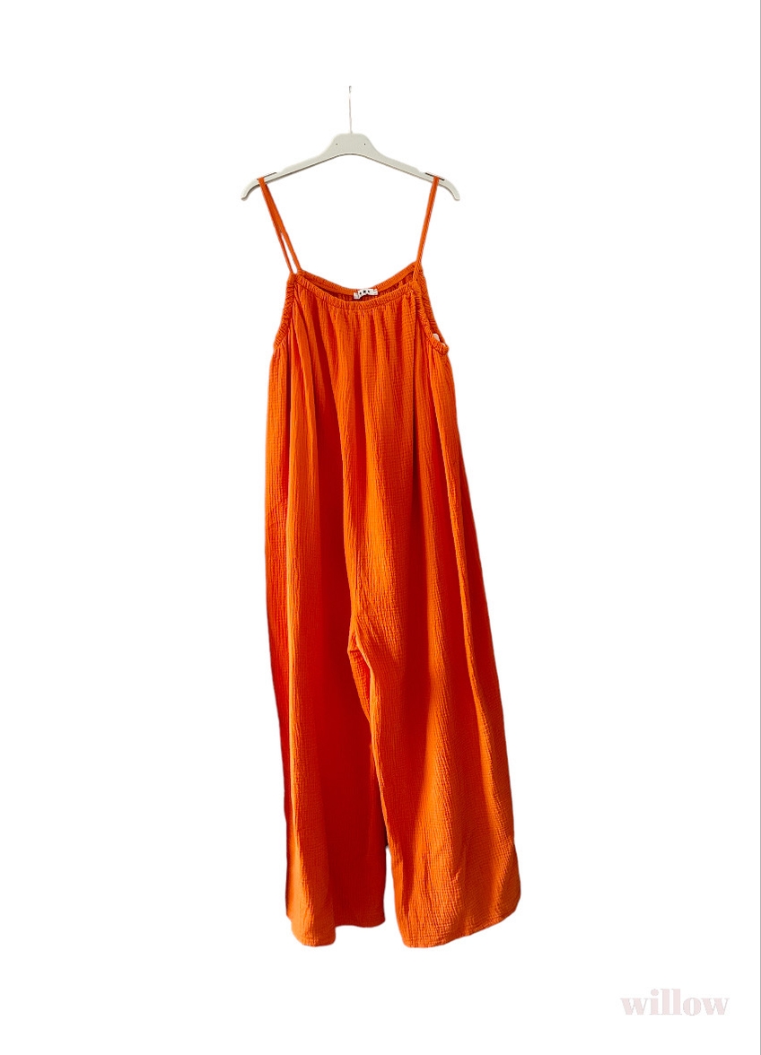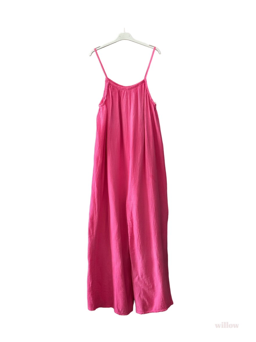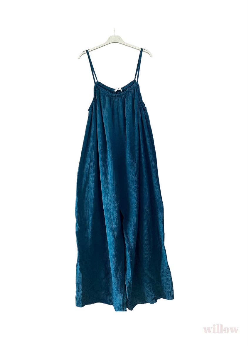100% cotton gauze jumpsuit. One size fits all. Flattering, cool, and comfortable. Belt if you like. The perfect slip on outfit for any occasion!