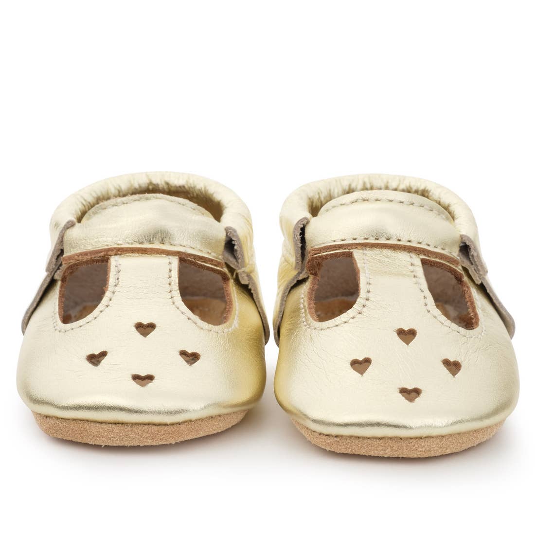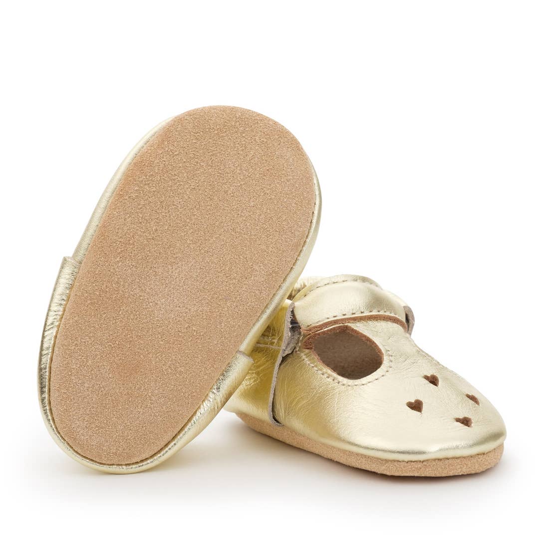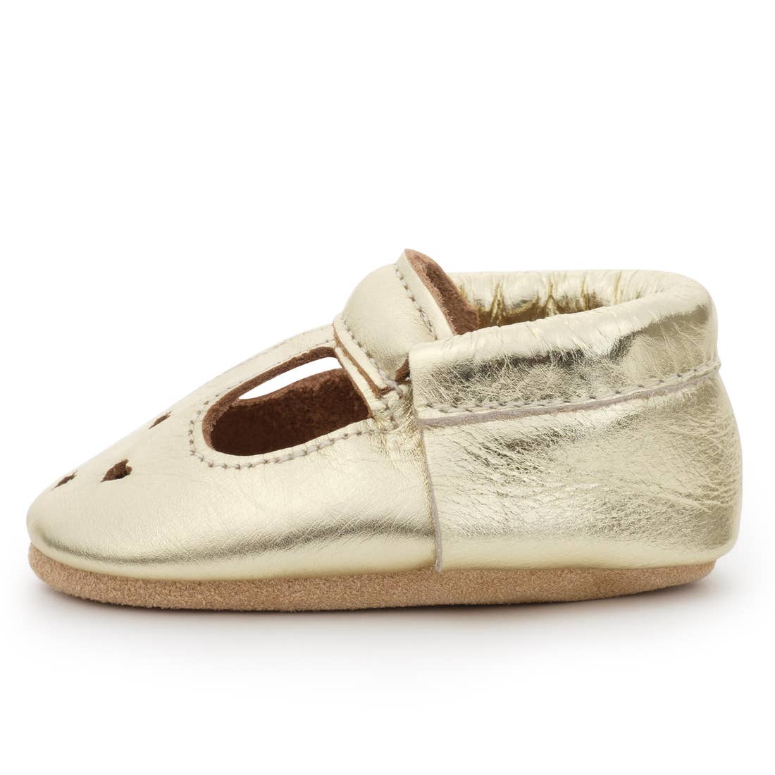 The Gold Mary Jane is a brilliant shiny addition to an outfit, and features a metallic gold upper and sole, with a T-shaped cutout and four heart details characteristic of the Mary Jane look. The elastic band at the ankle makes for easy on and off.