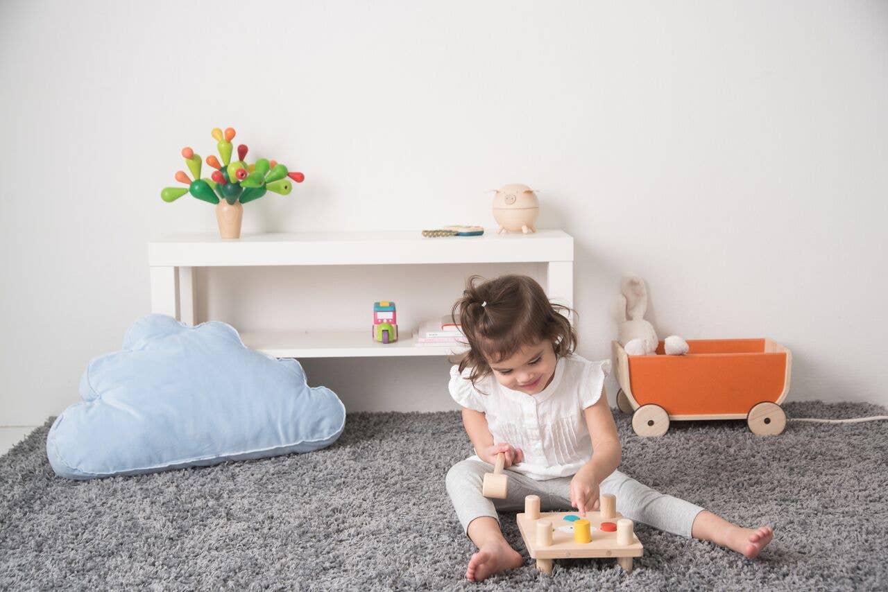 A four-hole wooden board with a wooden mallet for hammering practice. Children can turn it over and start the fun all over again. Suitable for children 12 months and up.