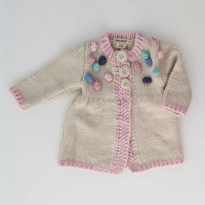 This fun swing-style sweater is knit in natural hued yarn and embellished with 'popcorn' dots in light pink, mauve, indigo blue, light blue, and mint. It has soft yarn button closures and is edged in matching light pink yarn. •100% acrylic. •Cold handwash.