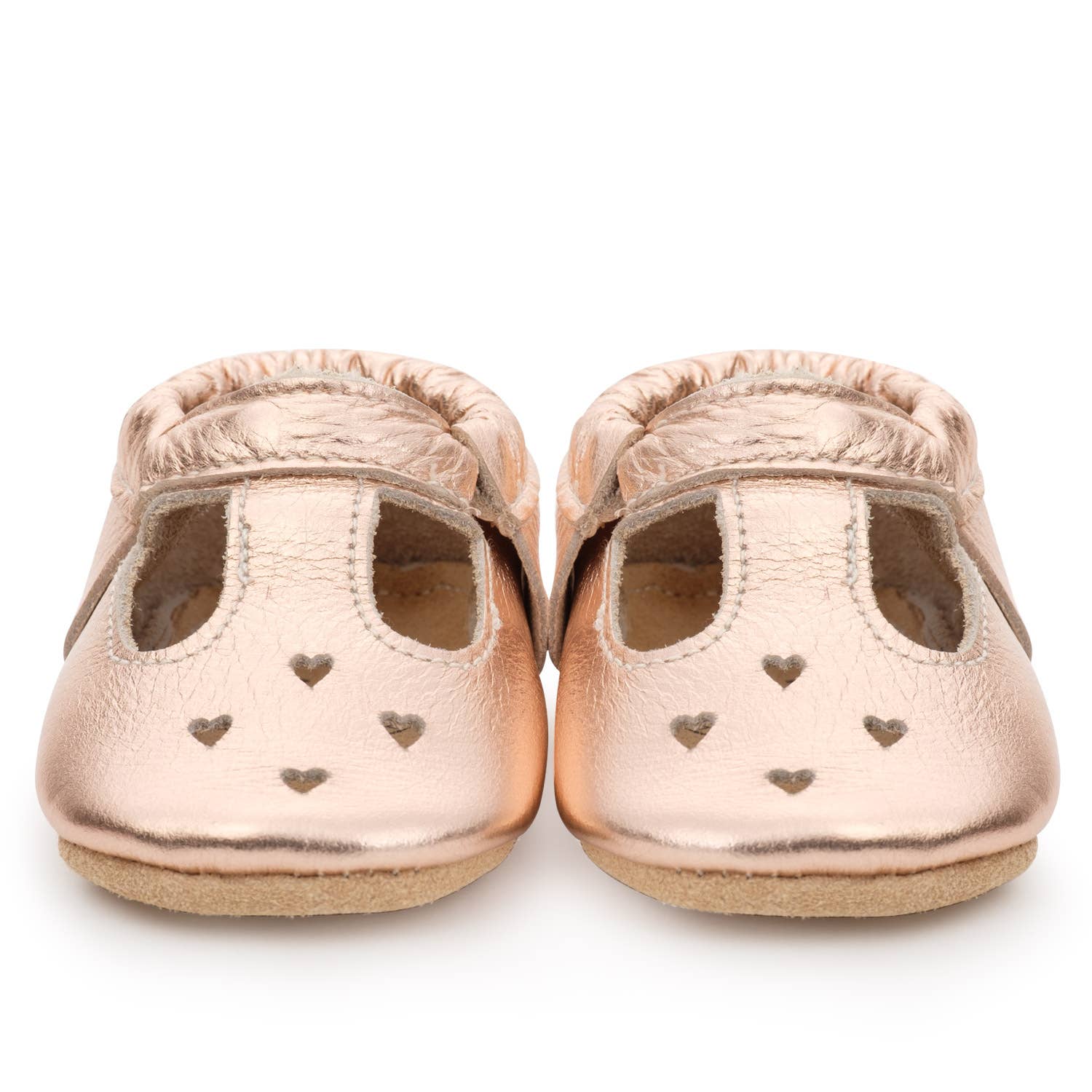 The Rose Gold Mary Jane is a brilliant shiny addition to an outfit, and features a metallic gold upper and sole, with a T-shaped cutout and four heart details characteristic of the Mary Jane look. The elastic band at the ankle makes for easy on and off.
