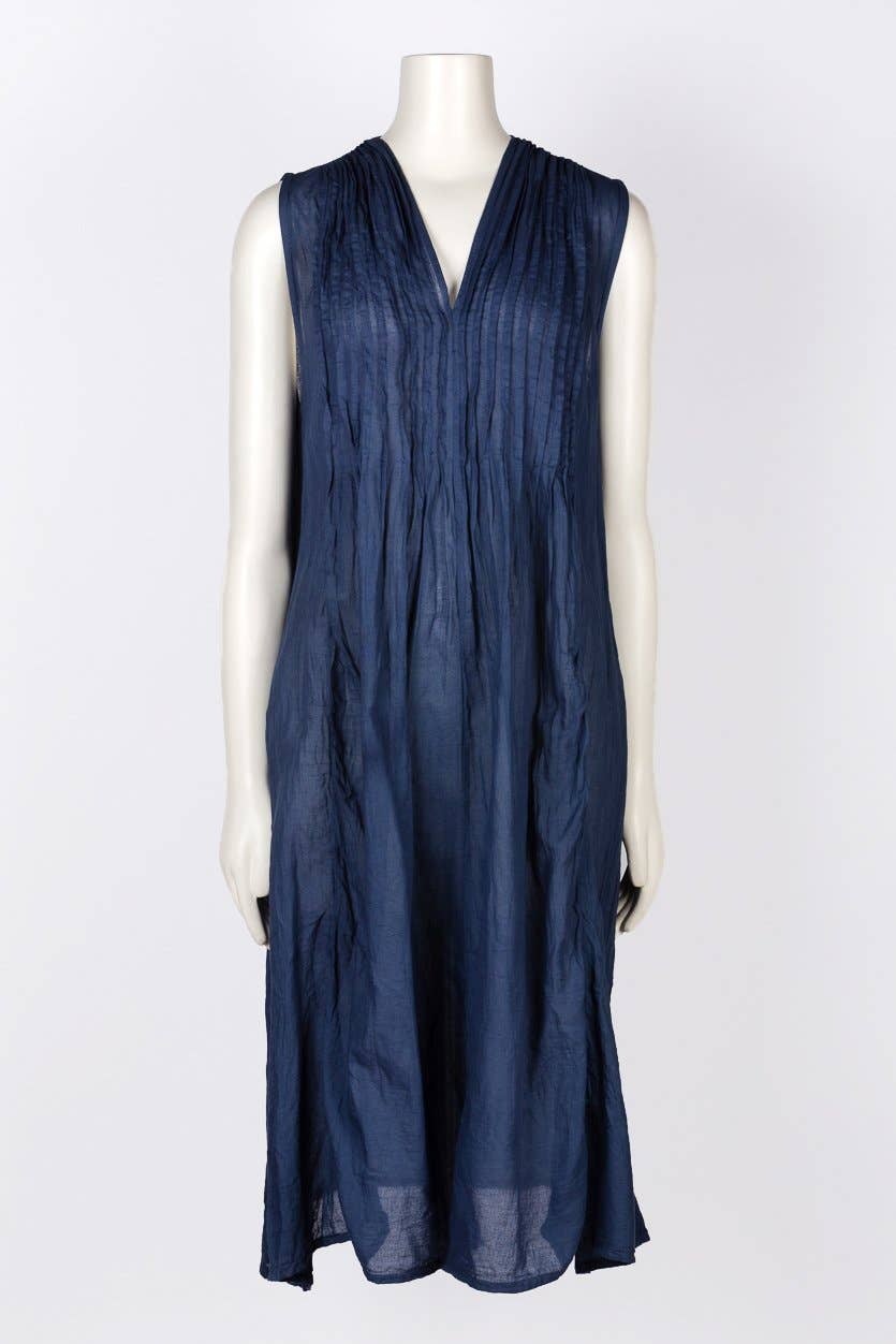 This feminine dress is cut from soft cotton fabric with a crinkled texture. The dress has a slight a-line fit and a mid length hem. It features a v-neckline, flattering pleats in the front, and pockets. This is one of our all-time favorites and looks great on everyone. One size fits all!.